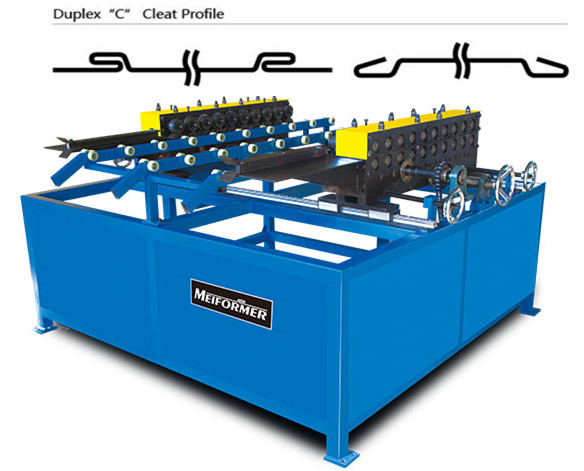 Duplex “C” Cleat Forming Machine MEIFORMER company designed the very nice duplex “C” cleat former machine. Our product use good material and nice manufacture rolls, Have Baldor motors, high precision needle-type bearing, heavy chassis plate, strong box, case hardened and ground roll shafes, also have arc welded steel stands. Those design promise the machine high quality and long work life. It will take you cost saving benefits.